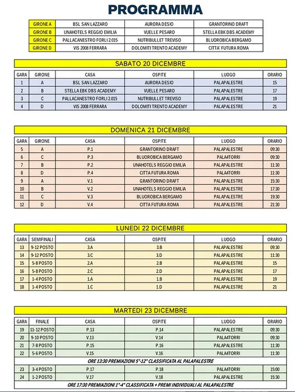 Il primo incontro per i nostri ragazzi è previsto domenica mattina alle 9.30 contro la perdente tra Forlì e Treviso; nel pomeriggio affronteranno invece la vincente dello stesso incontro.